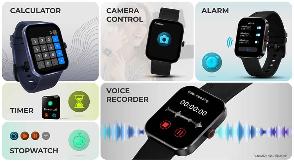 | Features | Sleep Monitor Women’s Health Tracker Animated Watchfaces 100 Plus Watchfaces Activity Tracker Sports Record Voice Recorder Calculator Camera & Music Control Lift To View Screen Time Phone Finder 5 Day Battery Stopwatch & Timer Sedentary Hydration Reminder Breathe |