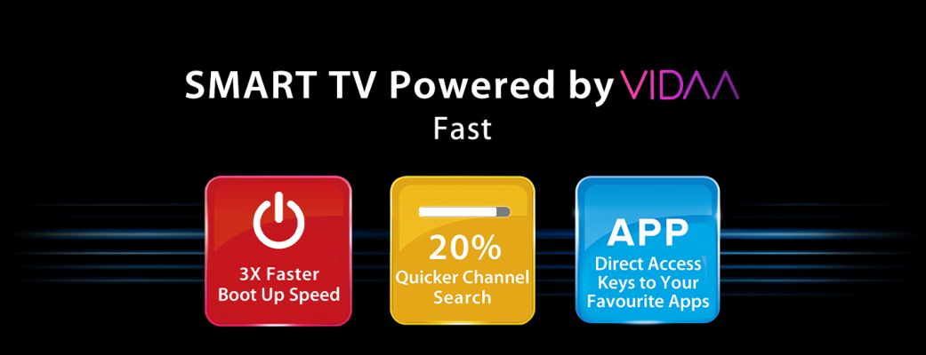 With no extra files to load unlike mobile based operating system, the VIDAA OS based television boots up 3x faster than normal TV and performs 20% channel faster search. With Direct access hotkeys on remote, your favorite apps can be accessed instantly.