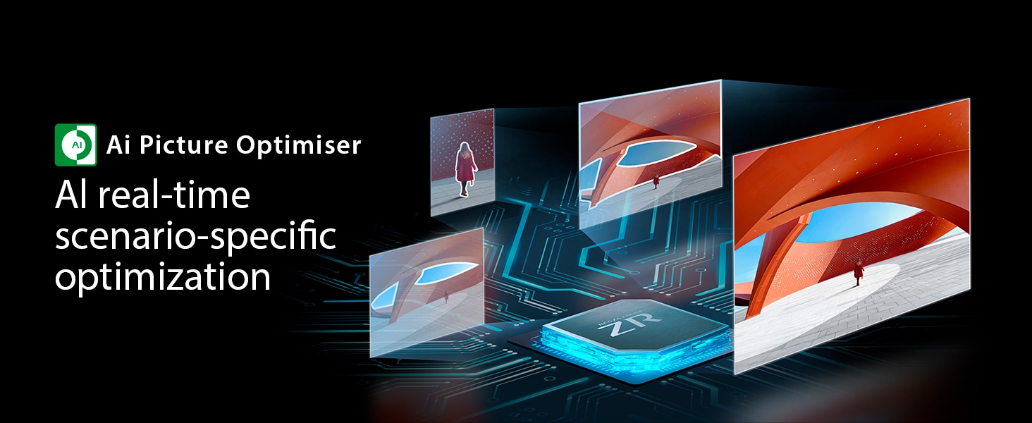 AI Picture Optimizer technology instantly captures every frame of the picture with inteligent recognition of up to 11 real-timescenarios (e.g.face, building, snowing, indoor lighting, etc), to make the viewing experience as real as possible based on the recognized scenarios. Let you get the most out of your contents with intelligently tailor-made picture quality.