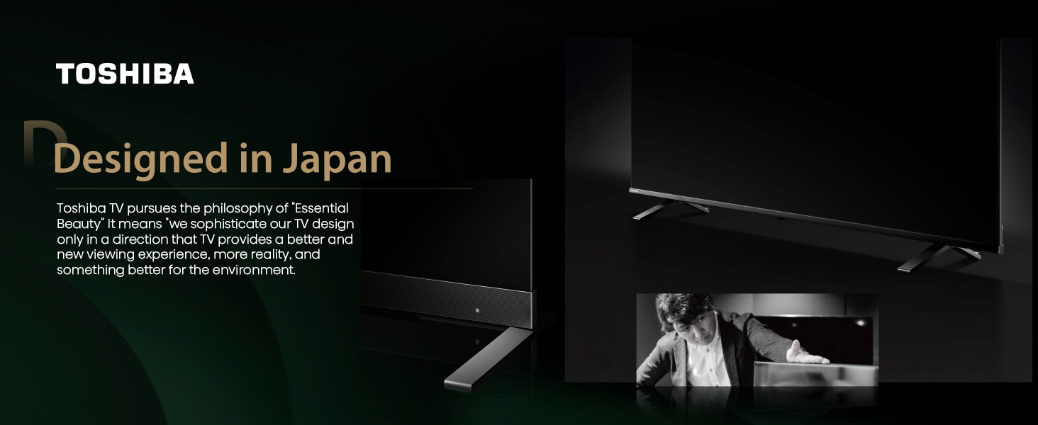 Toshiba TV pursues the philosophy of "Essential Beauty" It means we sophisticate our TV design only in a direction that TV provides a better and new viewing experience, more reality, and something better for the environment.