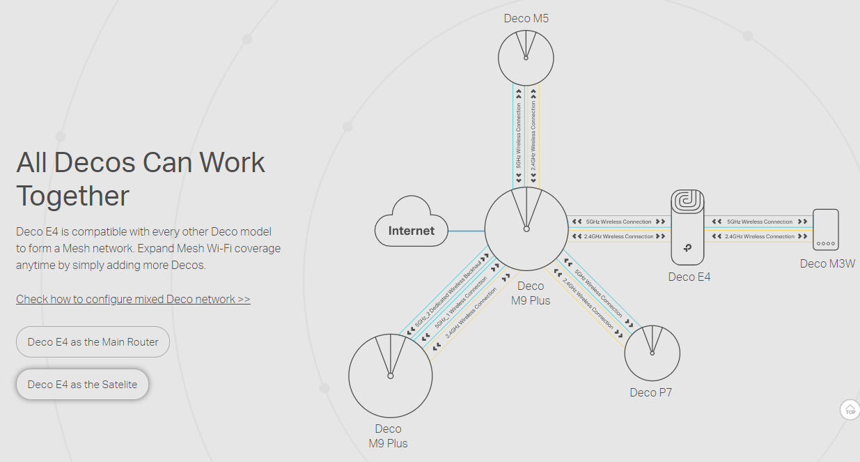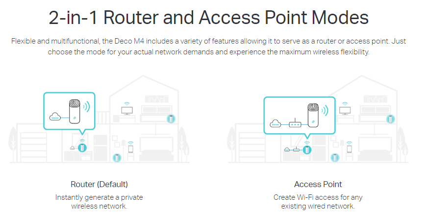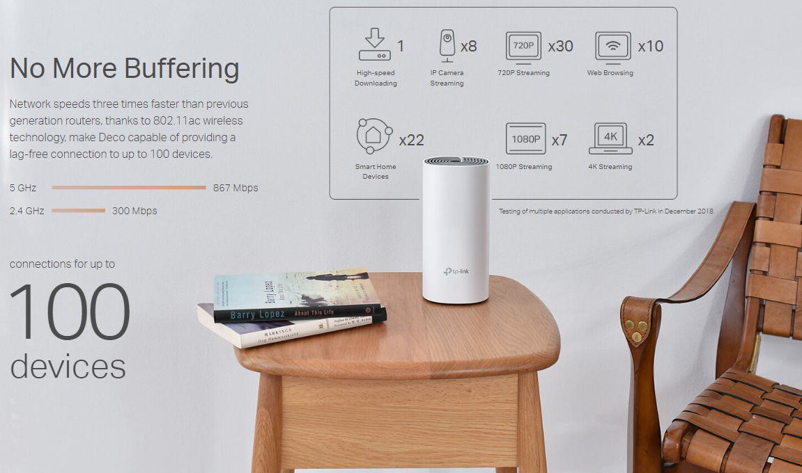 | Key Features | Deco app Support, Whole-home Wi-Fi coverage With advanced Deco Mesh Technology Devices automatically switch between Decos Handle traffic from even the busiest of networks Parental Controls limits online time and block inappropriate websites Delivers Wi-Fi to an area of up to 4000 square feet (EU version) Stable connections with speeds of up to 1167 Mbps |