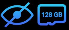 A microSD card stores up to 128 GB, equal to 384 hours (16 days) of footage. (based on laboratory conditions)