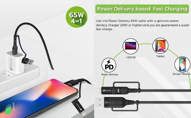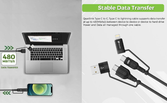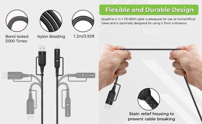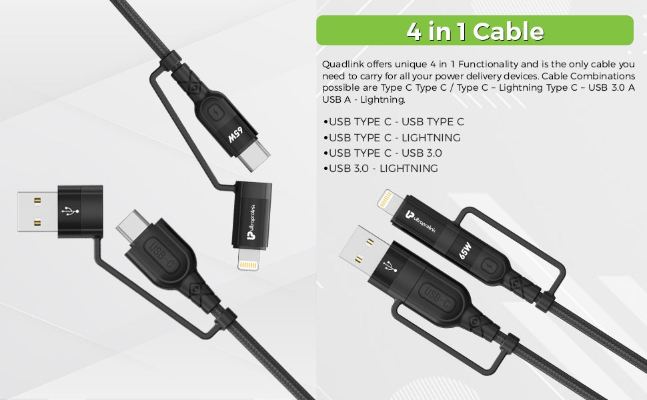 UltraProlink Quadlink UL1055 is the smarter & faster way to charge. With 4 in 1 functions this is the only cable you will ever need. When paired with an appropriate power delivery charger, Quadlink can charge power delivery enabled devices of upto 65W max and transfer data at speeds of 480mbits/s. This USB Type C to Type C power delivery cable will connect seamlessly to Type C enabled iPhone, iPad, Macbook, Surface laptops, Pixel, Chromebooks, Yoga, HP Elite & all the new crop of devices coming these days which are power hungry. Strengthened with Tangle-Free braided nylon and bend tested 5000 times for durability. Will also support devices that require power delivery of 20W,30W,45W & 87W.
