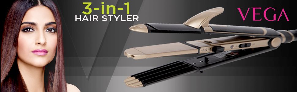 Why stick to one look when you have not two, but three to choose from? Silky, straight hair, glamorous curls or beautiful crimps. Vega 3-in-1 Hair Styler gives you the option to switch to different styles silky straight, textured crimps or gorgeous curls with one unique styler. The styler comes with -
