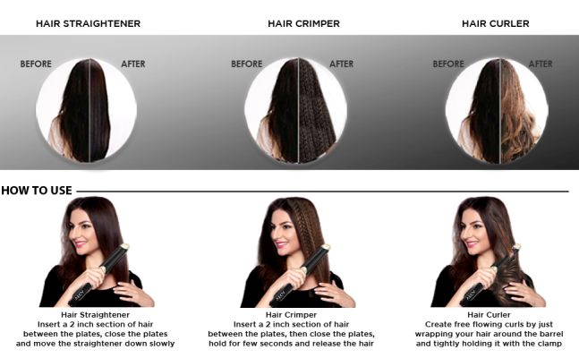 | Key Features | 3 In 1 Hair Styler 360 Degree Swivel Cord 220-240V,50 Hz, 45W Comes With On Off Switch Only One Button To Switch To Any Style |