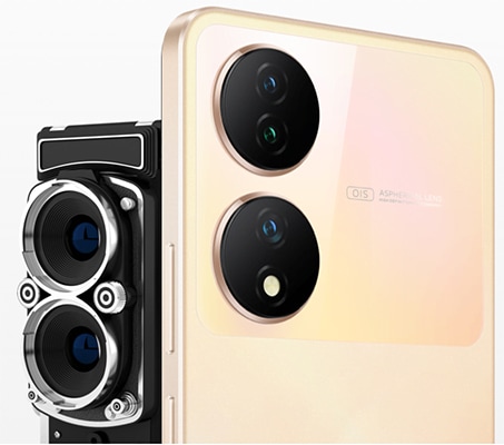 It is inspired by professional twin-lens reflex cameras. The Dual-Ring Pearl Glass shows a strong sense of style with pearl-like effect in the camera area, and offers a hint of the professional imaging capabilities.