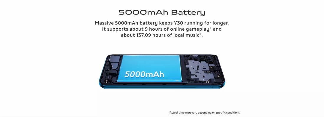 Massive 5000mAh battery keeps Y30 running for longer. It supports about 9 hours of online gameplay and about 137.09 hours of local music.