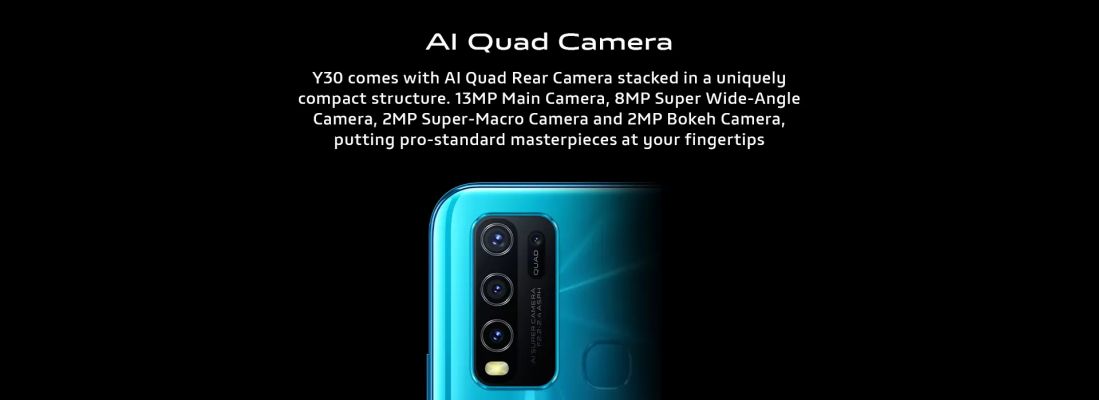 Y30 comes with AI Quad Rear Camera stacked in a uniquely compact structure. 13MP Main Camera, 8MP Super Wide-Angle Camera, 2MP Super-Macro Camera and 2MP Bokeh Camera, putting pro-standard masterpieces at your fingertips.
