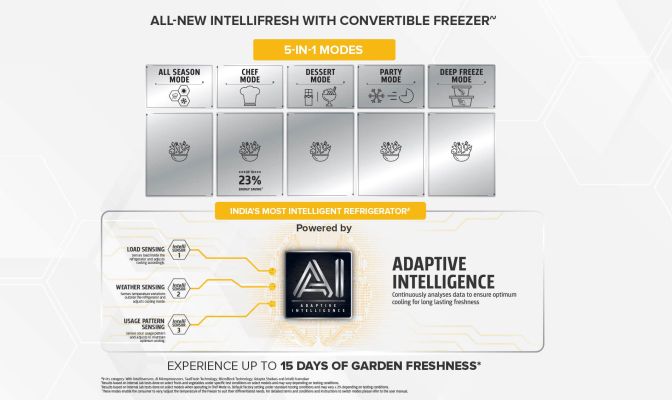 | Key Features | Up to 15 Days Garden Freshness, Precise temperature and Humidity control with Adaptive Intelligence Technology - AI Microprocessor and Intellisensors-a weather sensor, a usage pattern sensor A load sensor which sense, adapt and control the cooling inside the refrigerator Convertible Freezer 5 in 1 Modes - All Season Mode, Chef Mode, Dessert Mode, Party Mode, Deepfreeze Mode Up to 99 percent Bacteria Prevention with Microblock technology Prevents Excessive Ripening of Fruits and Vegetables with Zeolite Technology, Uniform Cooling with Freshflow Air Tower with Flexi Vents Optimum Moisture Retention with honeycomb design, Effective Anti Odor Action with Active Deo Cooling thats stays locked in with 6th sense Deepfreeze technology, Faster Cooling Energy Saving and Exceptional Durability with Intellisense Inverter, Everyday Fresh Tray, Infinity Shelf, Big Bottle Rack Large vegetable crisper, Ice Twister and Collector, Cooling Retention after Power cuts with chilling gel |