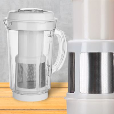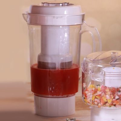 The juicer attachment is designed to fit with the big mixer jar. It includes a pusher to facilitate pushing the fruits/vegetables further inside while juicing them. The juicer attachment has a fine stainless steel mesh to filter the residue and give a pulp-free juice.