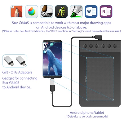 The XP-Pen G640S now supports connections with Android devices 6.0 and above. It is compatible with XP-Pen’s Deco Draw Drawing App and also compatible with Medibang, Autodesk Sketchbook, Zenbrush, Artrage, Microsoft Onenote, Microsoft Word, Markers and more
