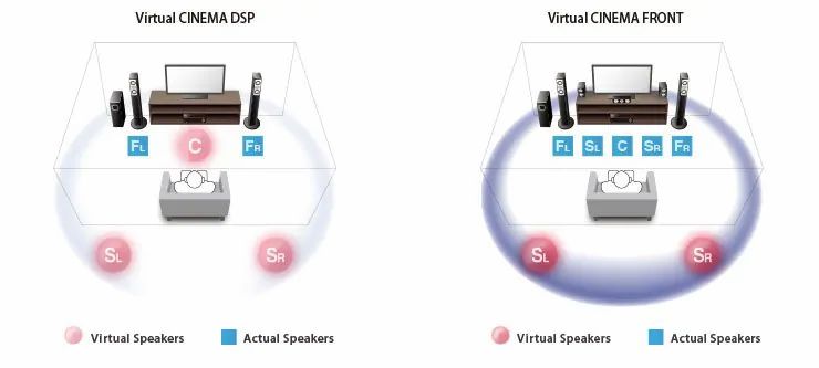 Even when it is impossible to install surround speakers behind the listening position, Virtual CINEMA DSP reproduces virtual 5-channel surround sound filled with realism, with only two front speakers. With Virtual CINEMA FRONT, you will enjoy virtual 5-channel surround sound with higher quality and resolution by installing surround speakers at the front. You get more flexibility to arrange your speakers inside the room, along with easy enjoyment of high quality surround sound.