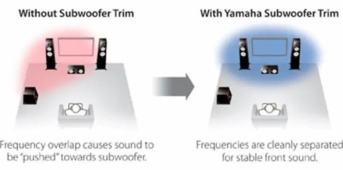The Subwoofer Trim control enhances the low frequencies by avoiding overlap with the front speaker output. This will result in a cleaner, more focused sound stage while providing a seamless frequency response. When subwoofer frequency overlap occurs in conventional systems, the overall sound is “pushed” toward the subwoofer. Subwoofer Trim takes care of this by separating the low subwoofer frequencies cleanly, thus stabilising the front stage while providing a well-balanced enhanced bass sound.