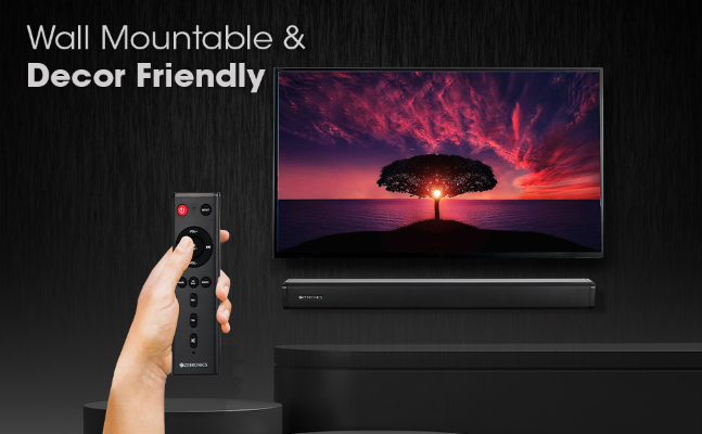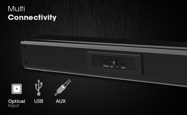 | Key Features | 2.0 channel soundbar Multi-connectivity options: Bluetooth, AUX, Optical IN, USB 5.8 cm and 9.8cm powerful dual wide range drivers Volume/Media controls, 4 ohm Impedance Remote control, Wall mountable External Power Adapter, LED lndicator |