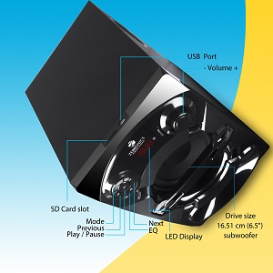| Key Features | 5.1 Channel speaker Wireless BT, USB, SD, FM, AUX, AC-3, Optical LED display 16.51 cm (6.5 inch) subwoofer Multicolor LED lights Remote control |