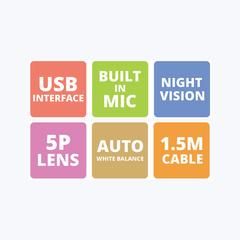 | Key Features | USB powered high-resolution web camera 5P lens and Full HD 1920x1080 Built-in mic Night vision White auto balance Control pod for brightness control Easy to mount clip-on design 1.5M long and strong cable |