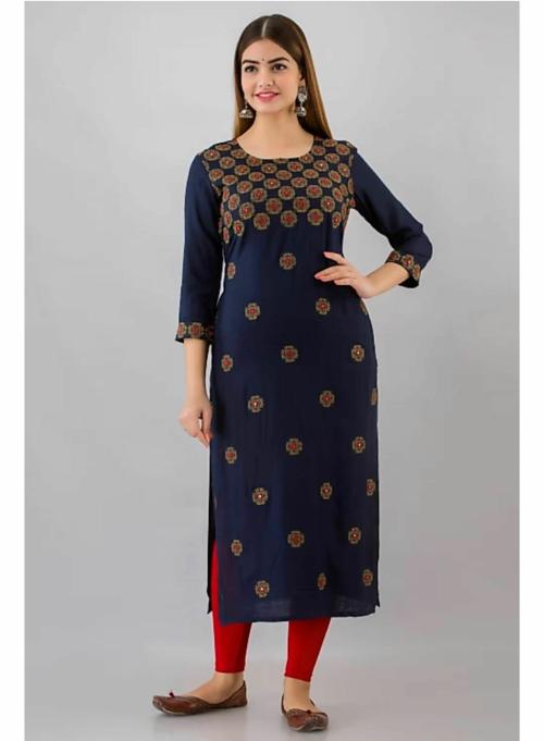 2083 N. Blue Embroidered Rayon Straight Kurta-M