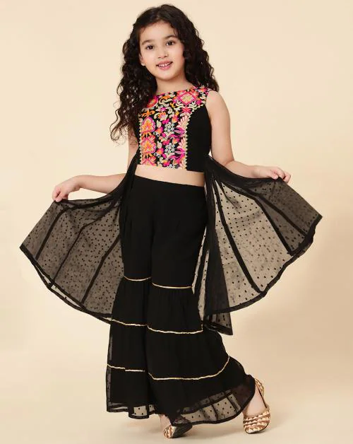 A.T.U.N. Girls Embroidered Black Sharara Set