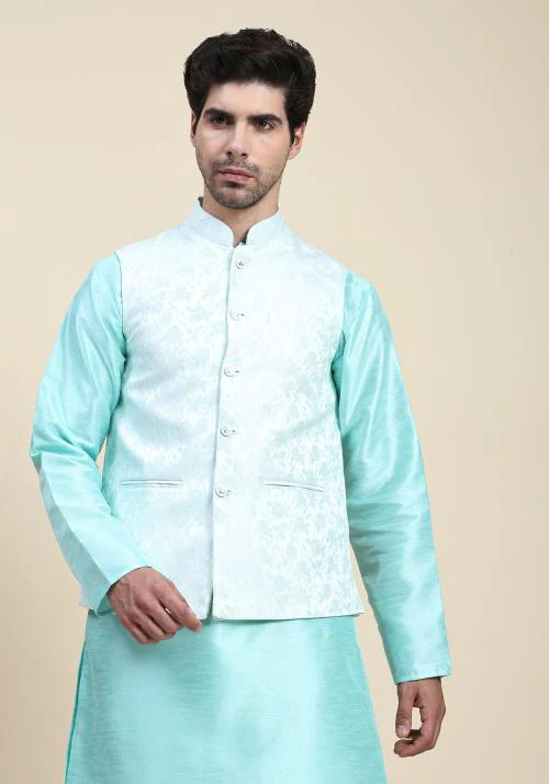 Aany's Culture Sea Green Floral Pattern Polyester Wedding Nehru Jacket (Koti) M
