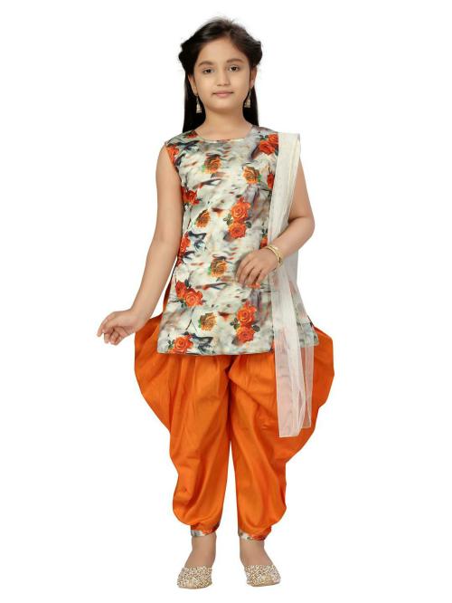 Aarika Girls Orange Floral Silk Kurta Suit Set