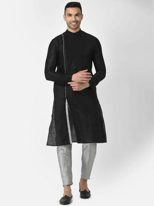 AHBABI Self Designed Silk Blend Plain Kurta Set for Men, Full Sleeves, Round Neck, Ethnic For Any Occasion Black