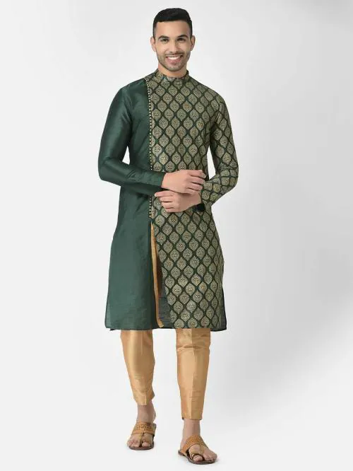 AHBABI Self Designed Silk Blend Printed Kurta Set for Men, Full Sleeves, Round Neck, Ethnic For Any Occasion Dark Green