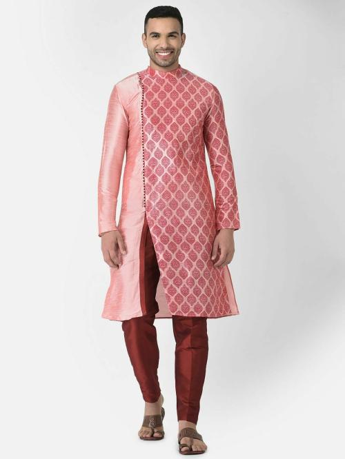 AHBABI Self Designed Silk Blend Printed Kurta Set for Men, Full Sleeves, Round Neck, Ethnic For Any Occasion Pink