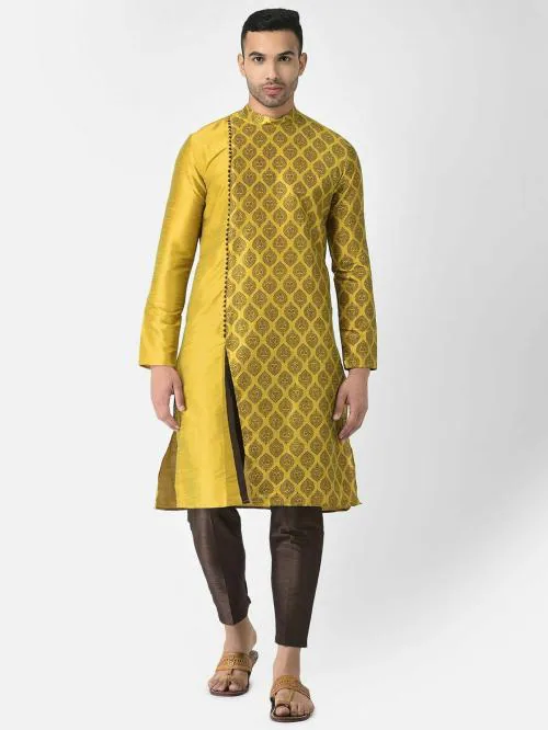 AHBABI Self Designed Silk Blend Printed Kurta Set for Men, Full Sleeves, Round Neck, Ethnic For Any Occasion Yellow