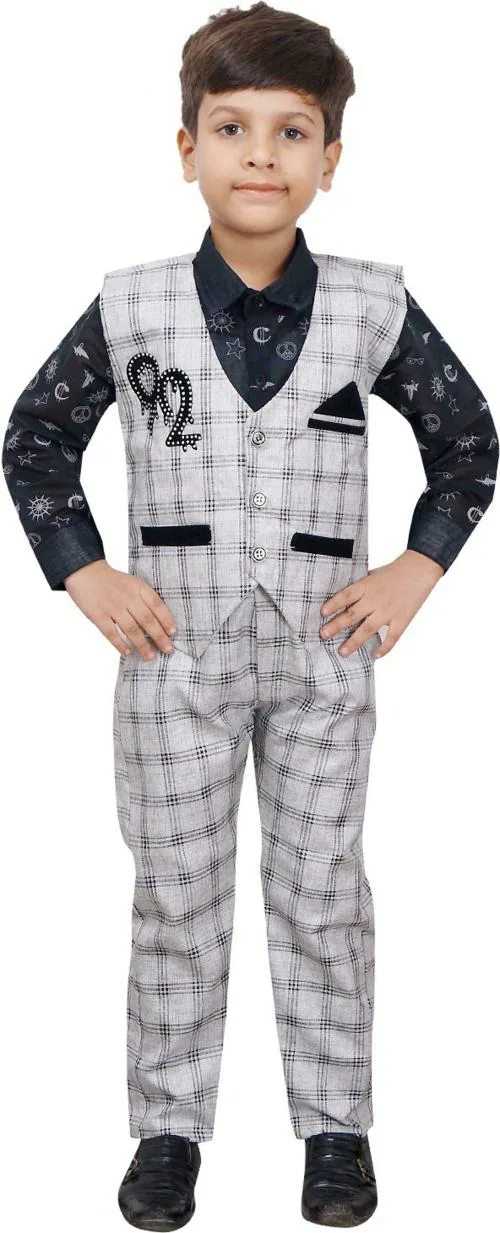 Ahhaaaa Boys Grey Full Sleeve Cotton Blend Checkered Shirt Waistcoat and Pant Set