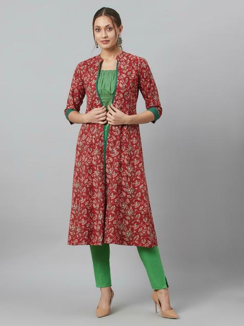 Aks Maroon Floral Print Kantha Work A-Line Jacket