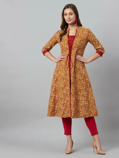 Aks Mustard Floral Print Kantha Work A-Line Jacket