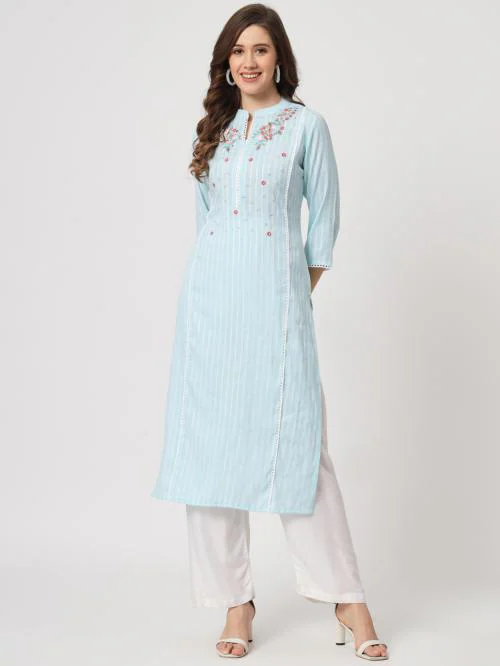 AMIRA'S INDIA ETHNIC WEAR Womens Dyed Yarn Viscose Embroidered Straight Kurta (Sky Blue)