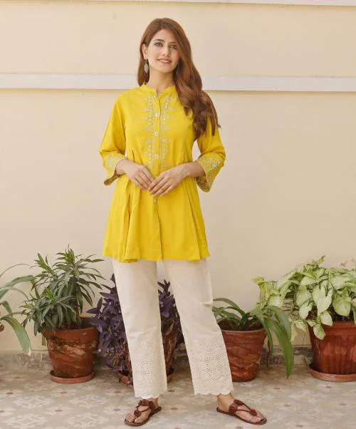 AMIRA'S INDIA ETHNIC WEAR Womens Rayon Embroidered Flared Short Kurta Cotton schiffli Pant Set (Mustard)