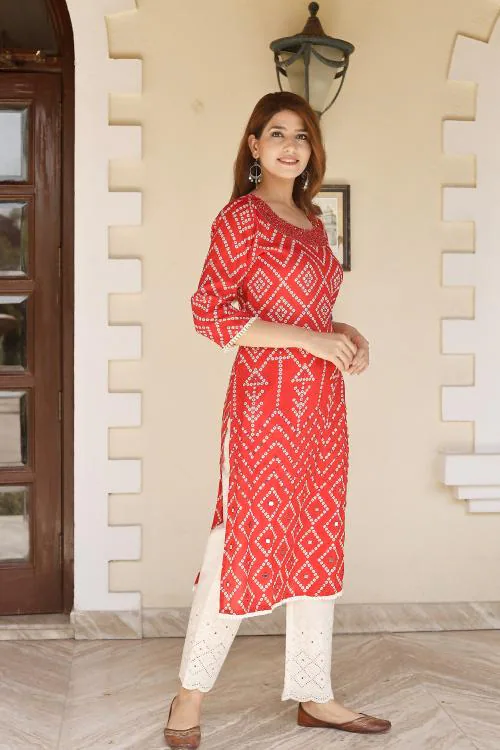 AMIRA'S INDIA ETHNIC WEAR Womens Viscose Silk Bandhej Print & Embroidered Straight Kurta Cotton schiffli Pant Set (Red)