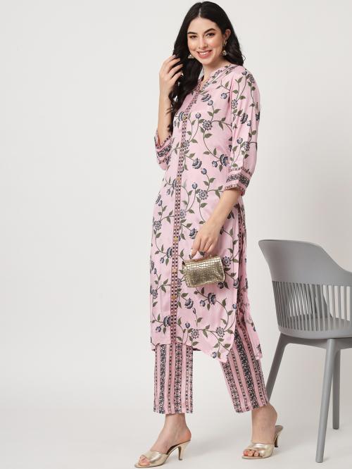 AMIRA'S INDIA ETHNIC WEAR Womens Viscose Silk Floral Printed Straight Kurta Pant Set (Pink)