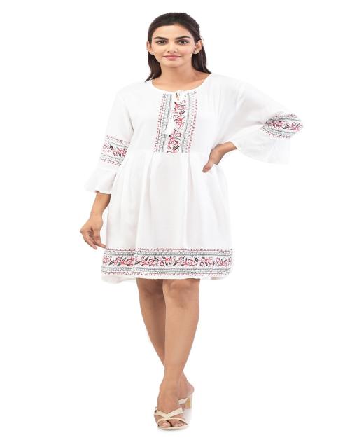 Anaghakart Women Apsara Rayon Printed Dress Fit And Flare White-L