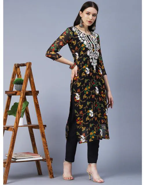 Anni Designer Women Black Printed Georgette Chikankari Embroidery Kurti