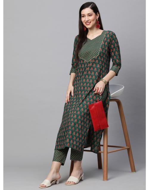 Anni Designer Women's Cotton Blend Green Straight Kurta with Trouser