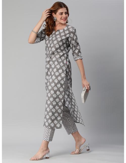 Anni Designer Women's Cotton Blend Grey Straight Printed Kurta with Trouser