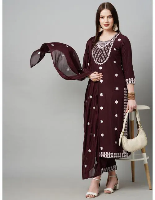 Anni Designer Women Wine Embroidered Staright Kurta with Trousers & Dupatta