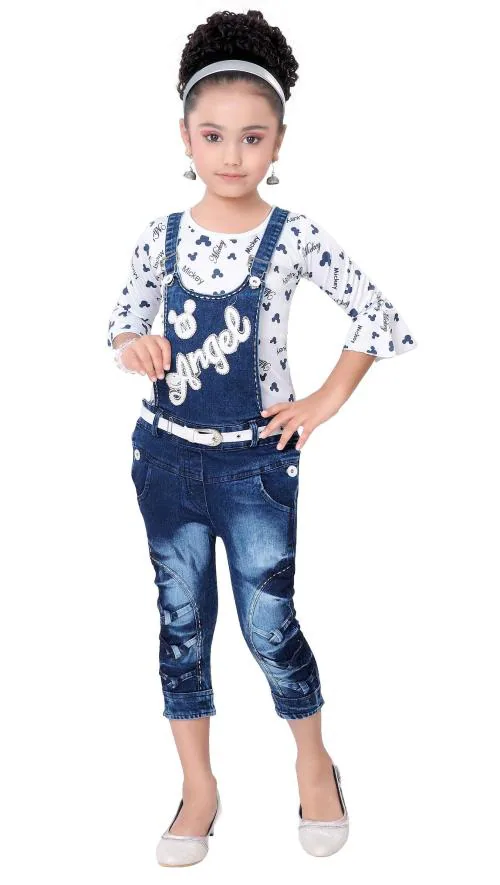 Arshia Fashions Girls Blue Denim Dungaree & Top Set