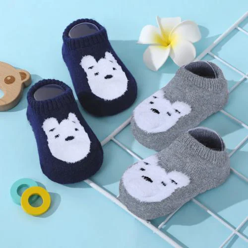 Baby Moo Bear Face Cotton Anti-Skid 2 Pair Socks - Grey