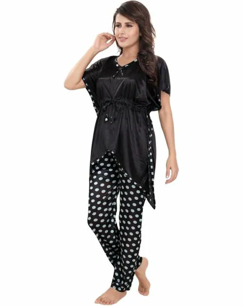 BAILEY SELLS Women Maroon Printed Satin Shirt and Pyjama Set - Free Size | Free Size T-Shirt & Pyjama Sets | Black T-Shirt & Pyjama Sets | Satin T-Shirt & Pyjama Sets | Night wear | Sleep wear