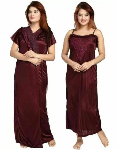 BAILEY SELLS Women Maroon Solid Satin Nighty with Robe - Free Size (Pack of 2) | Free Size Nighties | Maroon Nighties | Satin Nighties | Night wear | Sleep wear