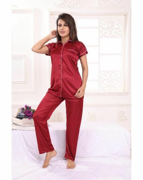 BAILEY SELLS Women Blue Solid Satin Shirt and Pyjama Set | Free Size Pyjamas | Maroon Pyjamas | Satin Pyjamas | Night wear | Sleep wear