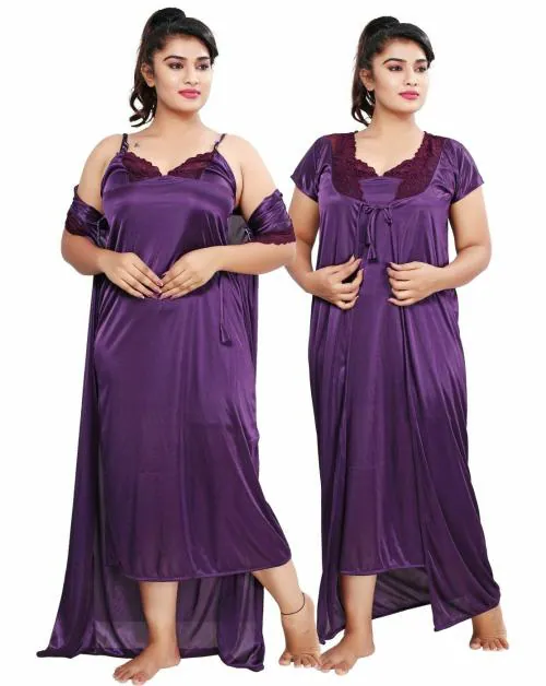 BAILEY SELLS Women Purple Satin Blend Nighty with Robe - Free Size | Free Size Nighties & Nightgowns | Purple Nighties & Nightgowns | Satin Blend Nighties & Nightgowns | Night wear | Sleep wear