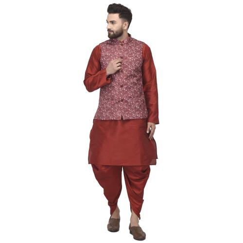 Banity Bey Men's Silk Blend Maroon Dhoti Kurta with Designer Ethnic Nehru Jacket /Modi Jacket/Waistcoat (Size: XL, JAISMIN)