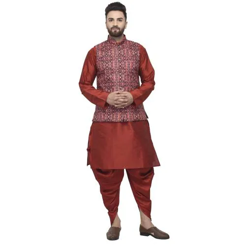 Banity Bey Men's Silk Blend Maroon Dhoti Kurta with Designer Ethnic Nehru Jacket /Modi Jacket/Waistcoat (Size: XXL, MT_MIX)