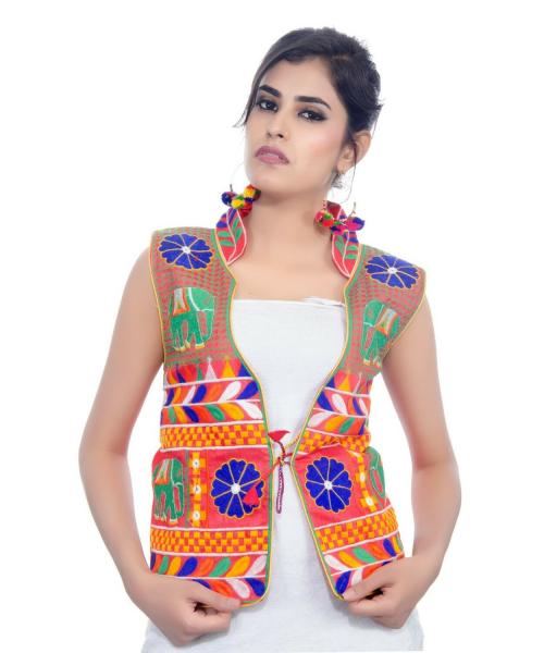 Banjara India's Waist Length Koti/Jacket/Shrug is designed with the best ethnic multicoloured prints that give a trendy look & feel. Pair this with any tee/top/kurti for best results, this will surely make heads turn. Light weight dupion silk fabric used for perfection. Comes in one-size which can fit upto bust size 40 inches, adjustable with drawstrings, the length is about 18 inches.