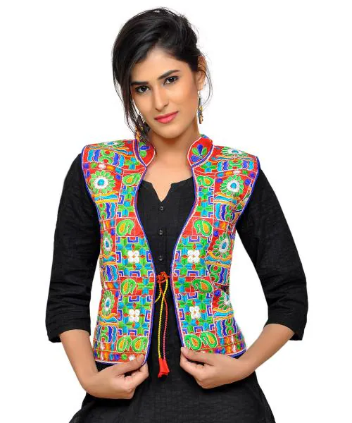 BANJARA INDIA Women Red Embroidered Dupion Silk Ethnic Jacket